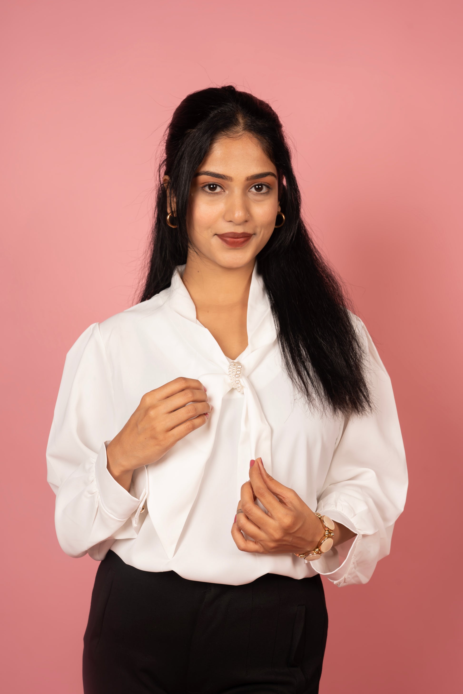 The Bow-elle Shirt is a blend of elegance and poise, featuring a graceful bow neckline adorned with delicate pearl detailing. Crafted from soft, flowy fabric, it offers a refined silhouette perfect for both office wear and evening elegance.
