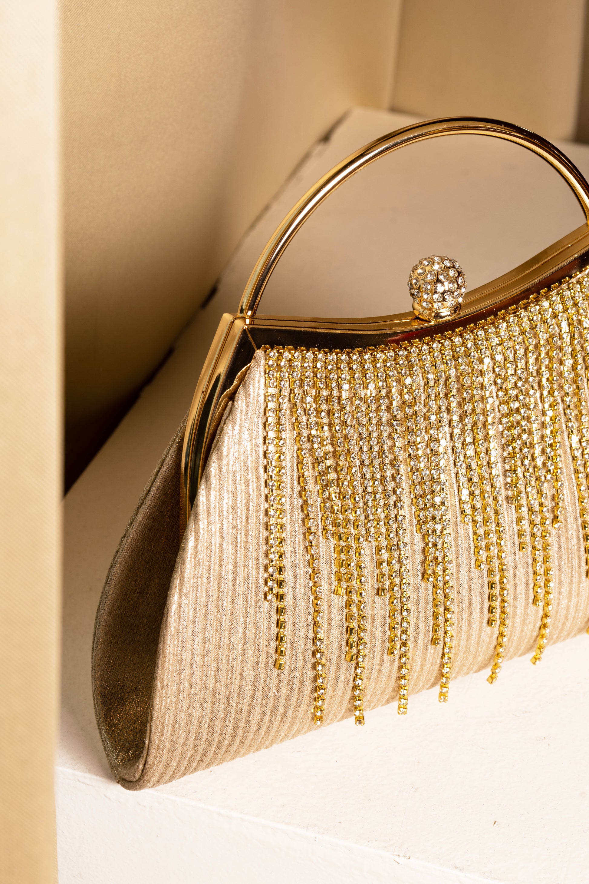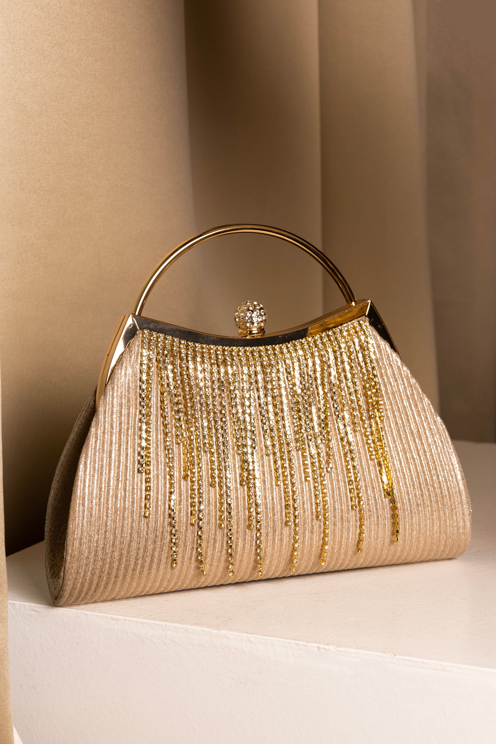 What makes Dazzella truly captivating are the dramatic cascading crystal tassels — gold on champagne and silver on black — that catch the light like a waterfall of brilliance. Compact yet roomy enough for your essentials, it’s the perfect companion for cocktail soirées, weddings, or any night that deserves a little extra shimmer.