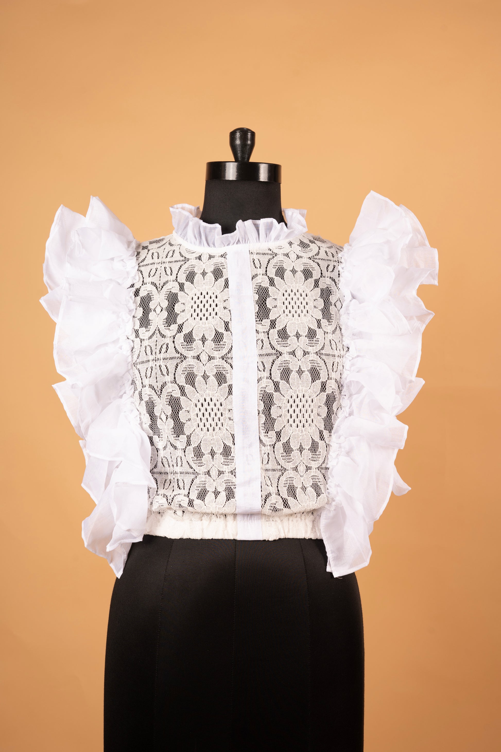 Step into a world of modern romance with the Frill Fusion Top. Designed in delicate lace and framed with dramatic ruffled organza sleeves, this piece captures both elegance and playfulness in equal measure. The cropped silhouette and high neckline create a striking contrast, making it perfect for everything from brunch dates to evening soirées. Available in black, pink, lilac, and white, it’s a statement of confidence and charm — a true muse’s choice.