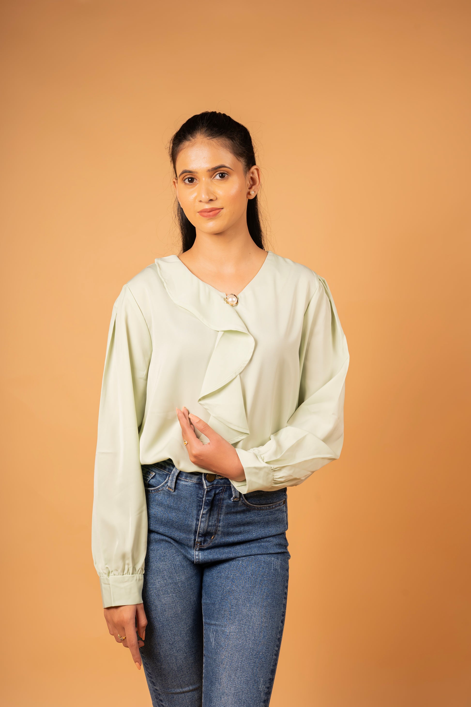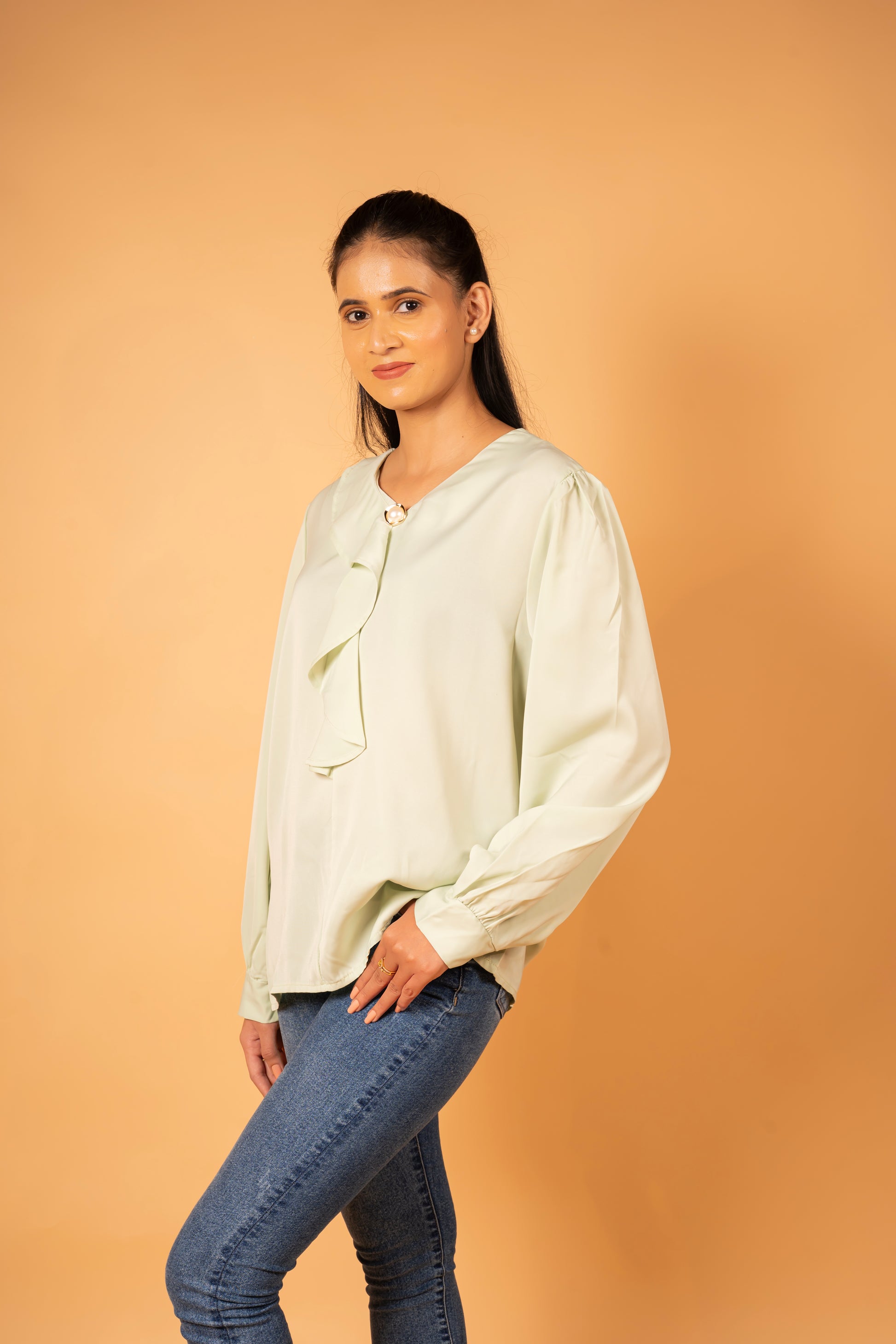 Crafted in a soft, flowy fabric, this blouse features an asymmetrical ruffle detailing that cascades effortlessly across the front, adding gentle movement and charm. The neckline is adorned with a statement pearl embellishment, giving it a refined and luxurious touch. The full-length sleeves are finished with structured cuffs, adding a polished edge to its delicate silhouette.