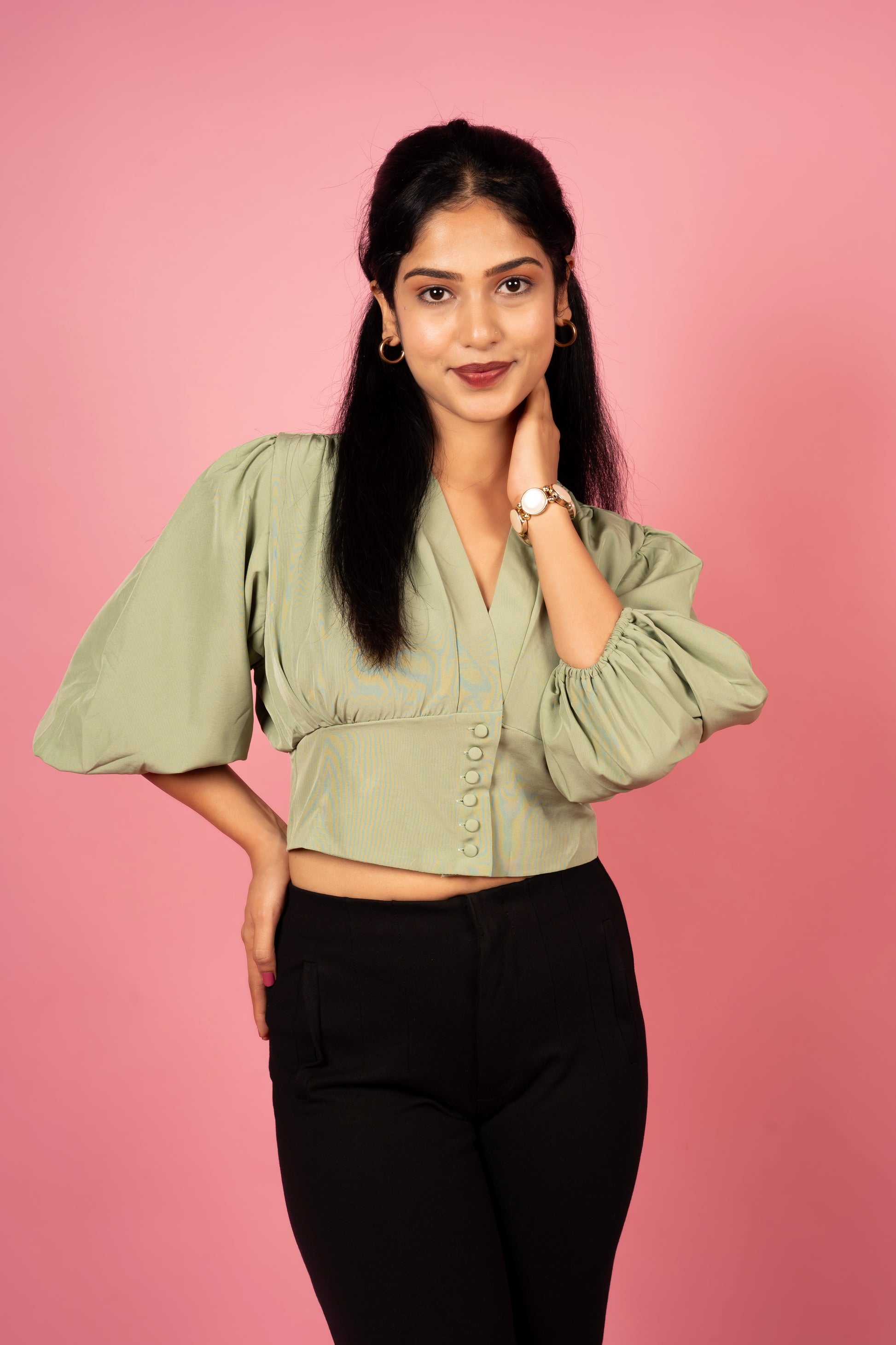 Elevate any look instantly with The Cropped Button-Up, a piece that exudes old Hollywood glamour and sophisticated structure. Rendered in a striking cropped jacket features an alluring open-front design with a delicate single-button closure adorned with matching fabric-covered buttons. The silhouette is defined by meticulous knife-pleating at the shoulders and a dramatically cinched waist, flowing into elegant three-quarter puff sleeves with gathered cuffs. It's the ultimate layering essential to transform a simple dress or top into a powerful, luxurious evening statement.