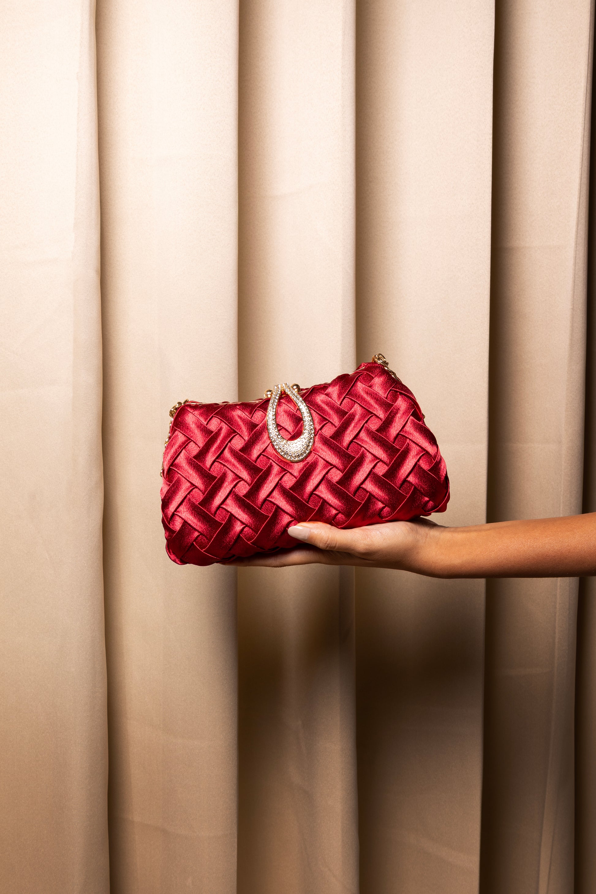The Elista Clutch exudes modern luxury with its woven satin texture and a crystal-studded teardrop embellishment that shines at the center. Designed with a metallic chain strap for versatility, it’s a statement piece that adds instant glamour to any evening look.