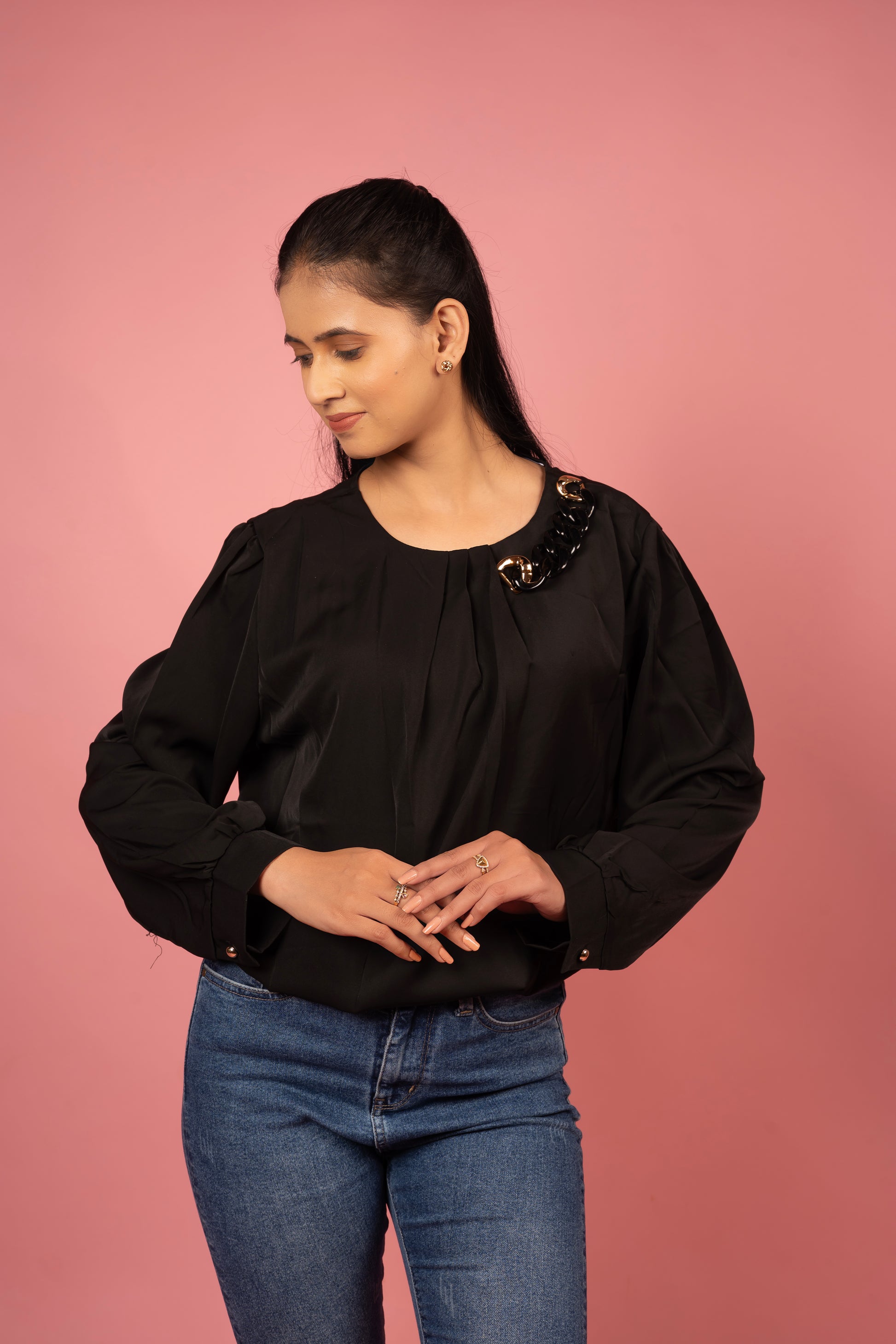 Introduce effortless sophistication into your wardrobe with The Chiffon Chain Blouse. Crafted from a fluid, whisper-soft fabric in a delicate, this piece drapes beautifully for an impeccable fit. The clean, collarless design is artfully gathered at the neck, creating subtle texture. The standout feature is the jewel-like gold-link hardware detail at the shoulder, offering a touch of unexpected glamour. Finished with elegantĀ full sleevesĀ cinched at the cuff by a small button, this blouse is a versatile statement of refined luxury for any occasion.