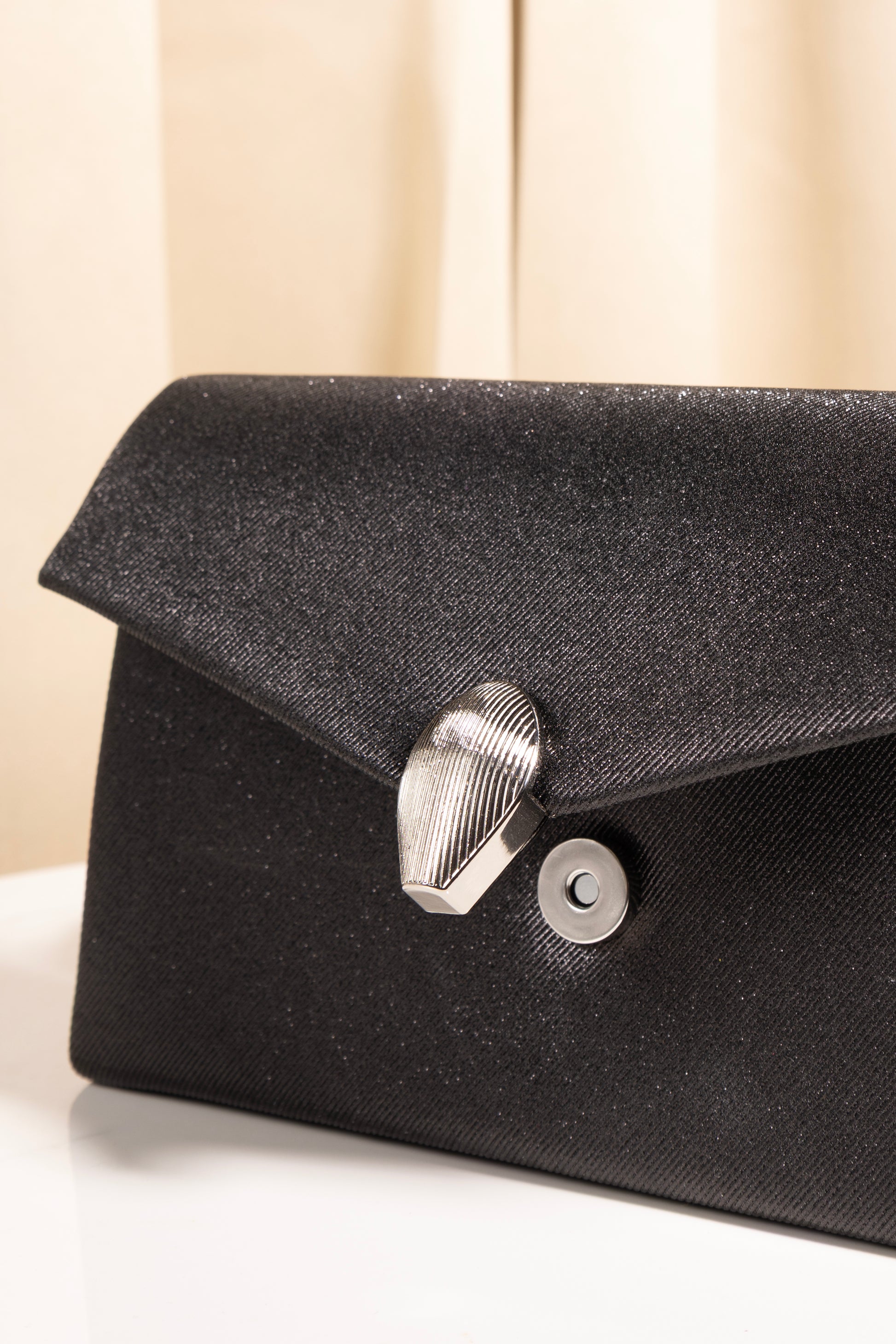 The Serene Clutch embodies minimal glamour and timeless sophistication. Crafted from shimmer-infused fabric that glows softly under the light, it captures the essence of understated elegance. The gold magnetic clasp doubles as a refined embellishment, adding a touch of luxury to its sleek, structured silhouette.