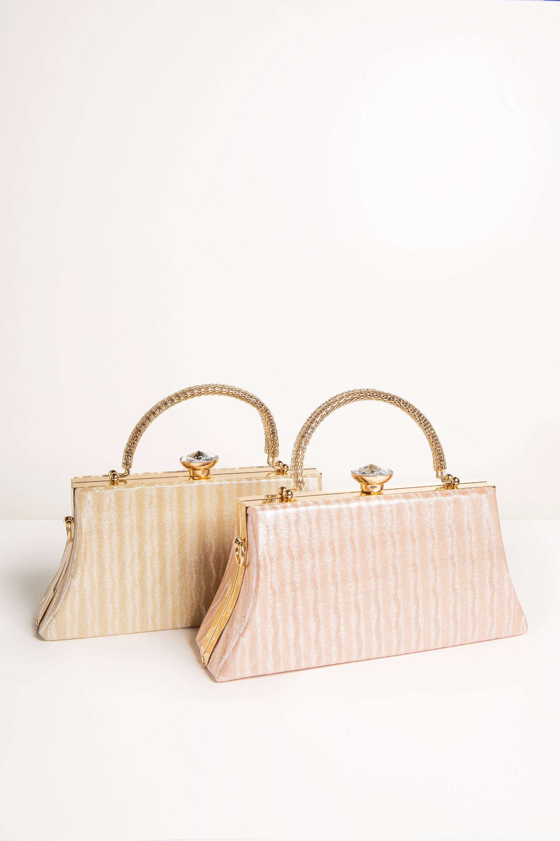 A crystal-cut clasp crowns the design like a jewel, adding a touch of radiant sparkle to its structured form. The textured gold handle enhances the look with warmth and luxury, while the spacious interior keeps your essentials secure without compromising style.